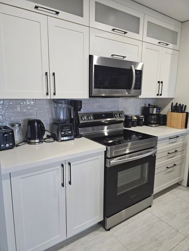 -kitchen counter tops, cupboards, tables, fridge wiping, microwave inside and outside, cleaning all the kitchen supplies, scrubbing the sink and stove (inside fridge and oven cleaning can ba added for additional fees), taking out the garbage